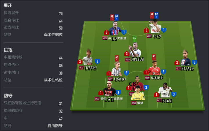 三中卫阵型,主体节奏为防守反击,阵型会回收得靠后,不用太多的控球和高位逼抢,核心主旨是“简单高效”。