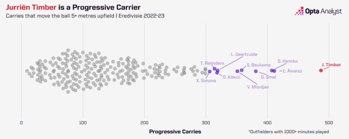 上赛季他的传球数据在荷甲是独树一帜的存在,廷贝尔每90分钟的推进式传球和向进攻三区的传球在荷甲都是遥遥领先。