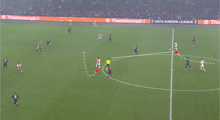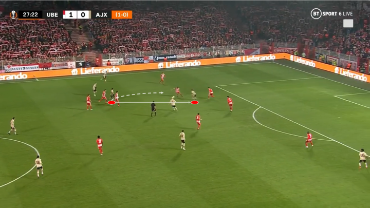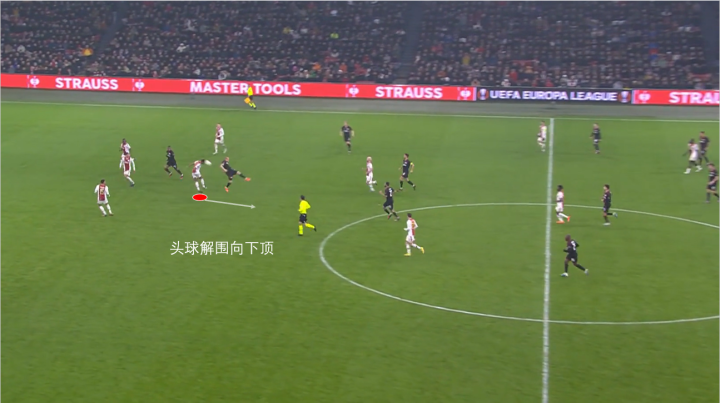 主场绝杀阿贾克斯的比赛中,两个进球都是来自于打廷贝尔这个点。在那场比赛中,廷贝尔8次一对一对抗只有1次成功。