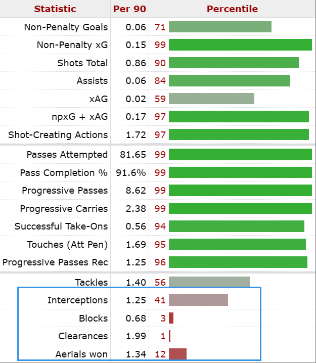 廷贝尔更加擅长进攻,在数据网站fBref的打分中,廷贝尔所有关于进攻的数据都近乎满分。而防守端则过于不堪,每90分钟1.4次的抢断是防守最好的数据,可也仅仅只能拿到56分,其拦截、封堵、解围和对抗更是一言难尽。