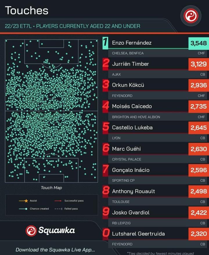 上赛季22岁以下球员中,触球次数最多的是切尔西的恩佐·费尔南德斯,廷贝尔3129次触球排在第二。值得一提的是,前五名的球员中柯克曲、凯塞多和卢克巴都是中前场的球员。