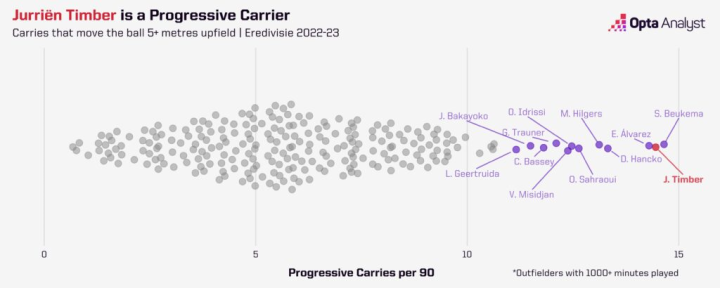 廷贝尔从中卫位置上突然的带球起速,经常会成为阿贾克斯进攻的一大重要利器。