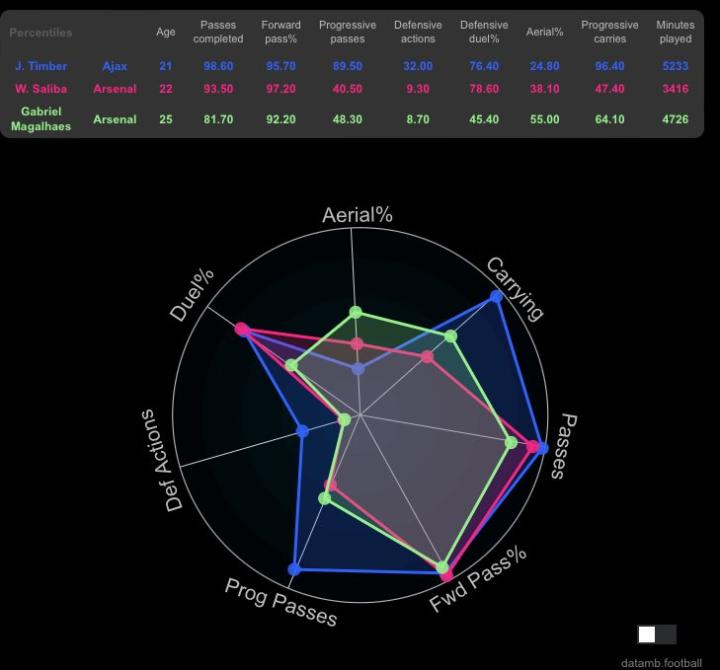 和阿森纳上赛季的两名中卫萨利巴和加布里埃尔相比,廷贝尔的传球和带球的数据都是更出色的一方。