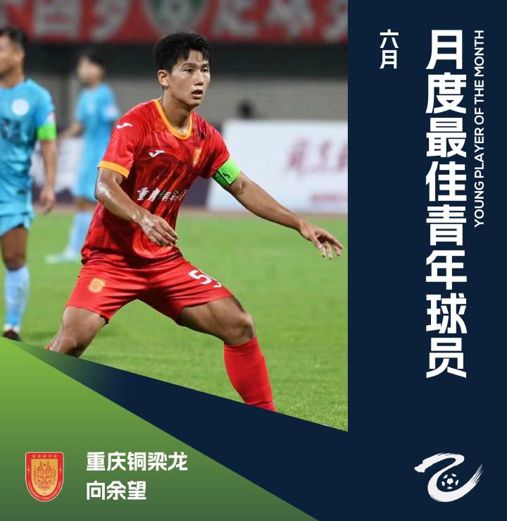 北京时间7月15日,中乙官方消息,重庆铜梁龙球员向余望当选中乙6月月度最佳年轻球员。