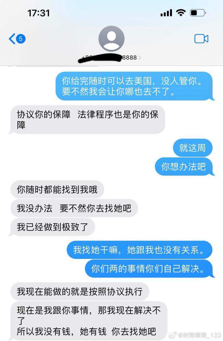 照片2:表示自己没钱让我找李梦要,我回复只找张隆要,没有钱就欠着,法院强制执行也行。你和李梦结婚那么大的钻戒都买了,结婚都有钱,孩子半年3万的费用之前还赖着不给。