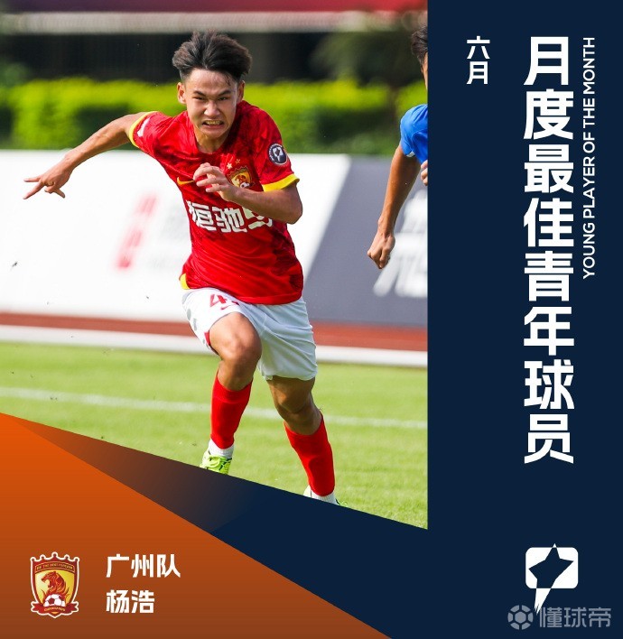中甲联赛官方宣布,广州队小将杨浩当选中甲6月最佳青年球员。