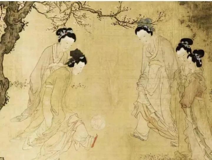 明代杜堇的《仕女蹴鞠图》描绘了唐朝女子踢球的画面。唐代,女子蹴鞠开始盛行与充气鞠有关,球更轻巧、弹性更强,很容易踢高踢出花样。