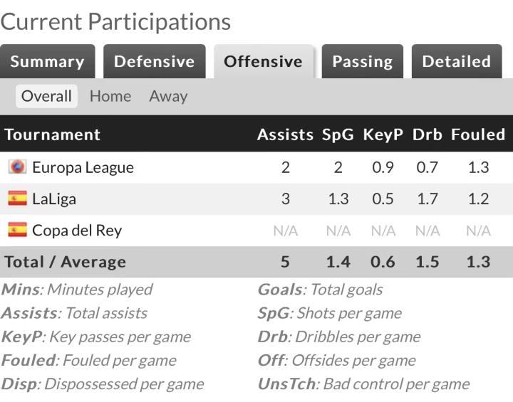 (2022/2023赛季的部分进攻端数据,可以看出场均1.5次的过人数据在西甲密集的中后场围剿里是较为出色的,但相对而言关键传球的贡献就少了很多)