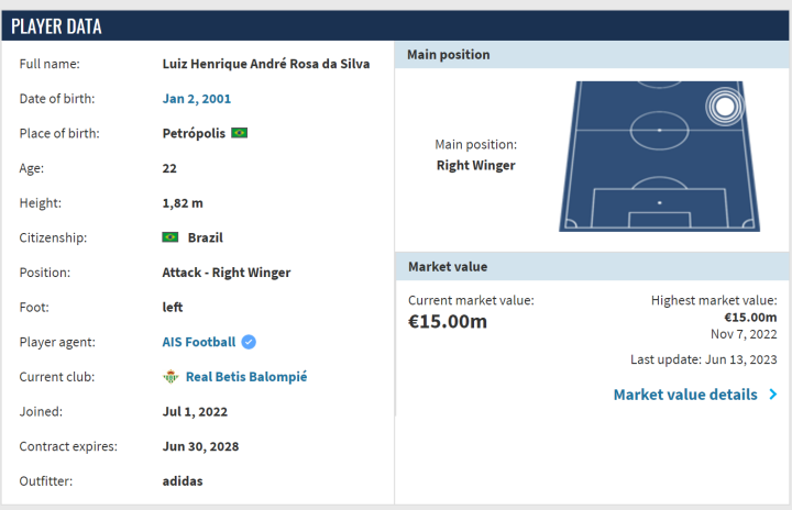 路易斯·恩里克(Luiz Henrique),2001年1月2日生于巴西彼得罗波利斯,现效力于西甲皇家贝蒂斯足球俱乐部。出道于巴甲弗鲁米嫩塞青训,2022/2023赛季被贝蒂斯招入麾下,起初贝蒂斯想逐步慢慢的培养这位在巴甲已经崭露头角的小将,但令人意外的是在胡安米等锋线大将接连受伤的情况下,小恩里克竟然用半个赛季慢慢坐稳了自己的首发位置,同时在欧战赛场,比如对阵罗马的比赛中也有亮眼的发挥。