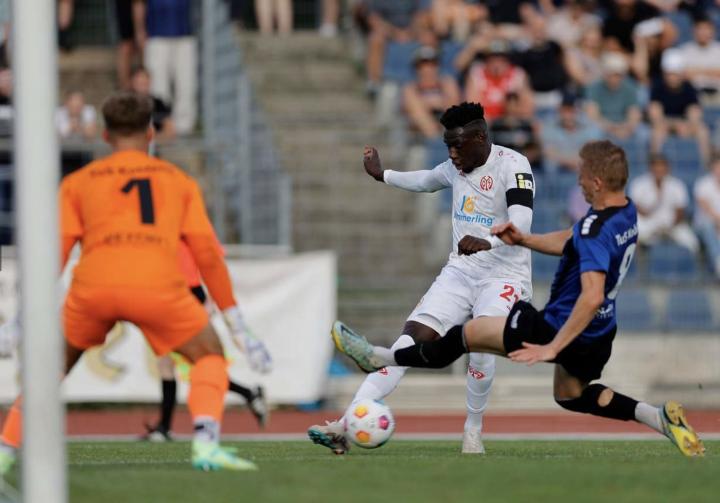 比赛开场,作为逆足右边锋的格鲁达本场被安排在顺足位置,想来应该是教练的有意安排,一方面踢上赛季还在德高联的球队不至于出全力,另一方面右侧让达科斯塔和巴尔科克配合更顺手。结果开局没多久,对手高球打到前场,哈克前顶补中场,莱奇解围直接打到对手脚下,19岁的年轻黑人前锋顺势杀入禁区,面对门将推射得手,美因茨落后了。