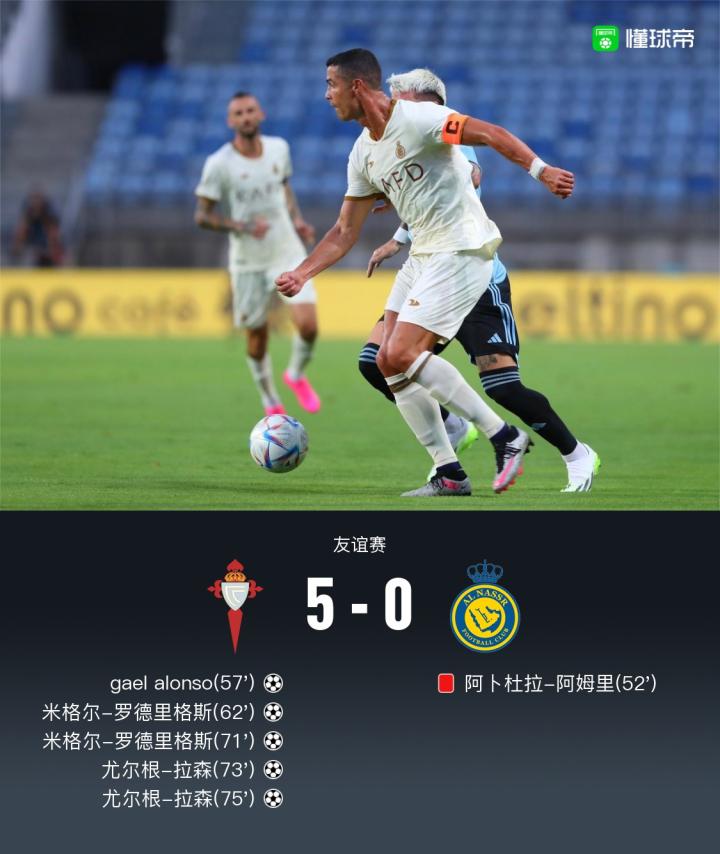 十人利雅得胜利0-5塞尔塔,C罗造险,罗德里格斯、拉森双响