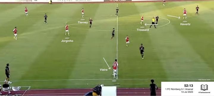 当雅库布·基维奥尔或基兰·蒂尔尼从左后卫的位置向内收的时候,莱昂德罗·特罗萨德和凯·哈弗茨都会拉到边路。