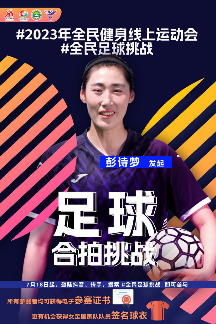 #2023年全民健身线上运动会##全民足球挑战#...足球中国 @懂球帝2023-07-19 16:37#2023年全民健身线上运动会##全民足球挑战# 开始啦!女足队员彭诗梦发起了足球合拍挑战,7月18日起,登陆足球中国抖、快平台,搜索“彭诗梦足球合拍挑战”即可参与,赶快来试试你的球技吧!如果你的视频很棒,还有机会获得女足国家队队员签名球衣哦~展开更多