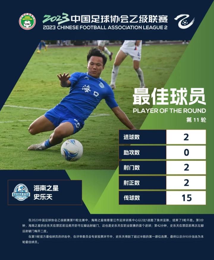 北京时间7月19日,中乙联赛官方宣布,海南之星前锋史乐天当选中乙本轮最佳球员。