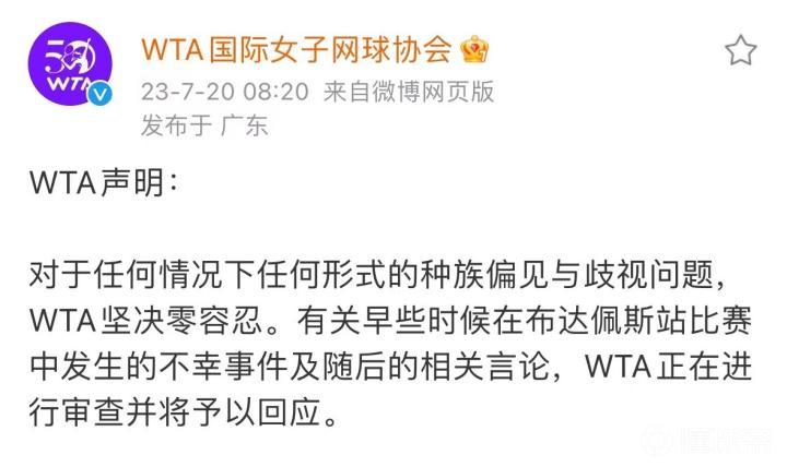 北京时间今天凌晨,WTA国际女子网球协会在各社交媒体做出官方回应:对于任何情况下任何形式的种族偏见与歧视问题,WTA坚决零容忍,有关早些时候在布达佩斯站比赛中发生的不幸事件及随后的相关言论,WTA正在进行审查并将予以回应。