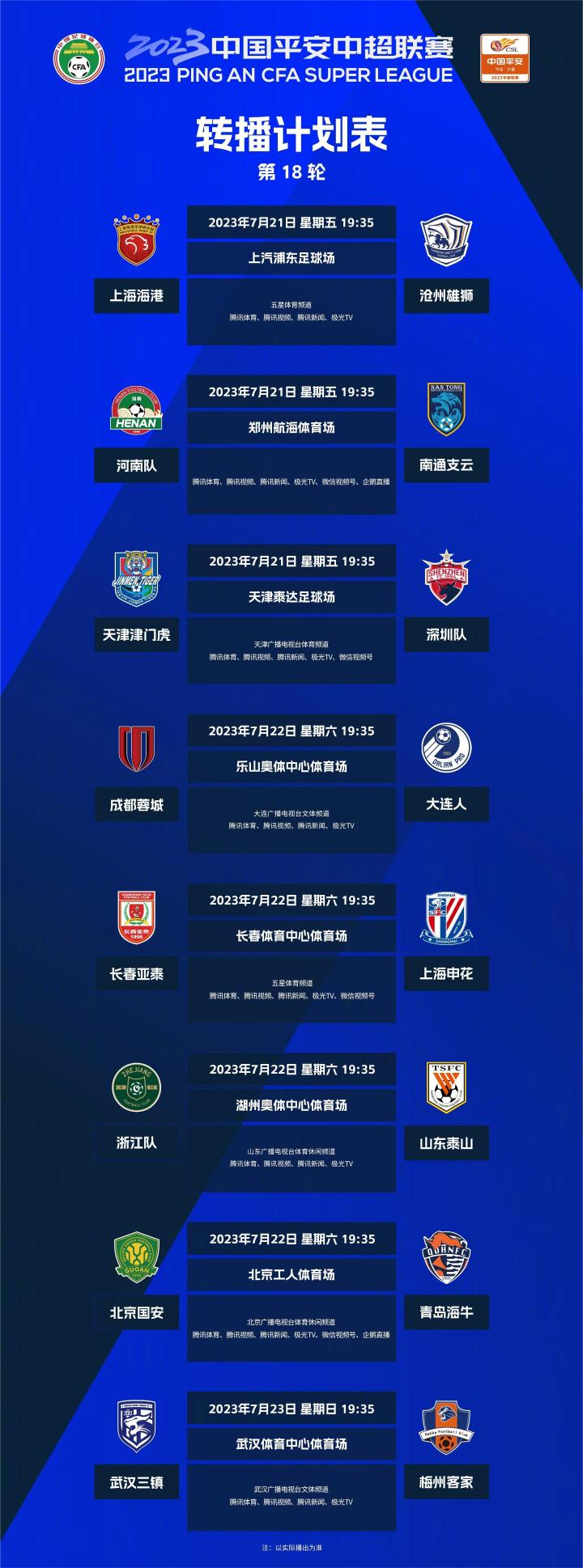7月21日(星期五)-23日,2023赛季中超联赛将展开第18轮角逐。7月20日晚,中超官方发布了本轮转播计划表。