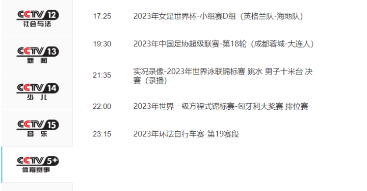 不管怎样,从中超官方发布的转播计划表来看,本轮中超8场比赛,都没有出现CCTV5、CCTV5+进行现场直播的信息。相关时段里,央视体育安排播出的赛事,除了有女足世界杯之外,还有2023年世界泳联世锦赛花样游泳集体自由自选决赛,2023年全国田径锦标赛男子100米、女子标枪决赛等。