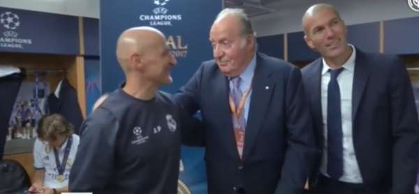 2017年皇马4-1击败尤文图斯卫冕欧冠后,西班牙前任国王胡安·卡洛斯一世来到皇马的更衣室。