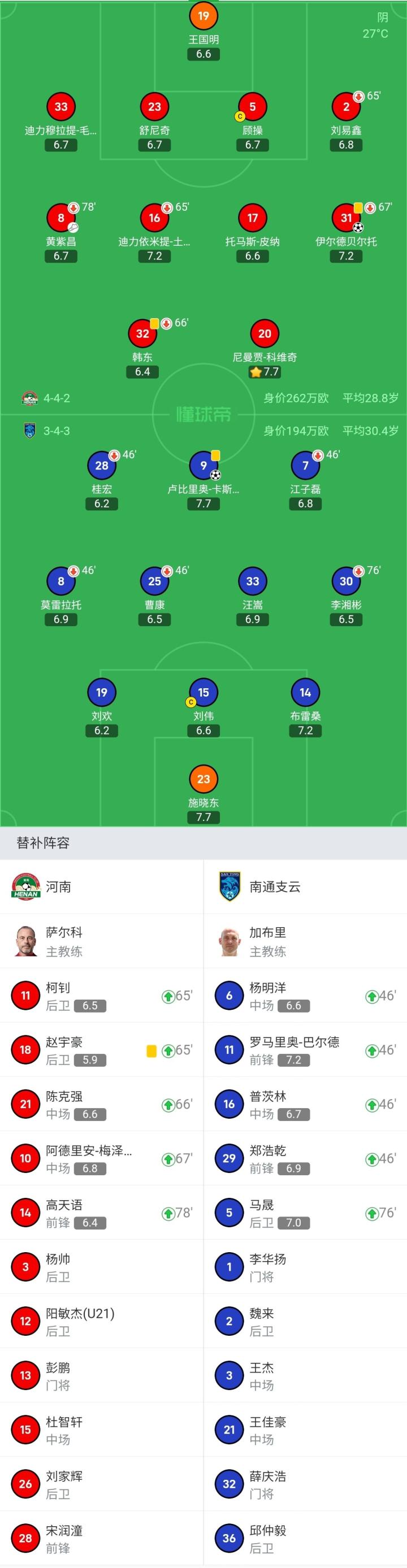 河南首发:19-王国明、5-顾操、6-王上源、23-舒尼奇、33-迪力穆拉提、16-迪力依米提(65'18-赵宇豪)、32-韩东(66'21-陈克强)、8-黄紫昌、2-刘易鑫(65'11-柯钊)、31-贝尔托(67'10-阿德里安)、20-科维奇