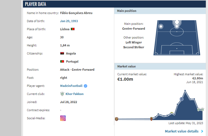 他的故事从这里开始,情节就变得单调且相似了起来:在波尔图区的小城里,他快速成为球队征战葡甲的主力前锋。两赛季葡甲的亮眼发挥之后,又顺理成章地成为葡超莫雷拉人的一员。联赛级别和竞争水平的提升,并没有带给他太多困扰,短暂的适应之后,便在新球队坐稳首发前锋的位置,依然是亮眼的数据体现。给球队带来超过两百万欧的利润后,他的下一站变成了沙特阿拉伯的巴腾(Batin)俱乐部。21/22赛季,尽管巴腾最终保级失败,但个人的发挥还是为阿布鲁在阿联酋找到了新工作——豪尔费坎俱乐部(Khor Fakkan)。