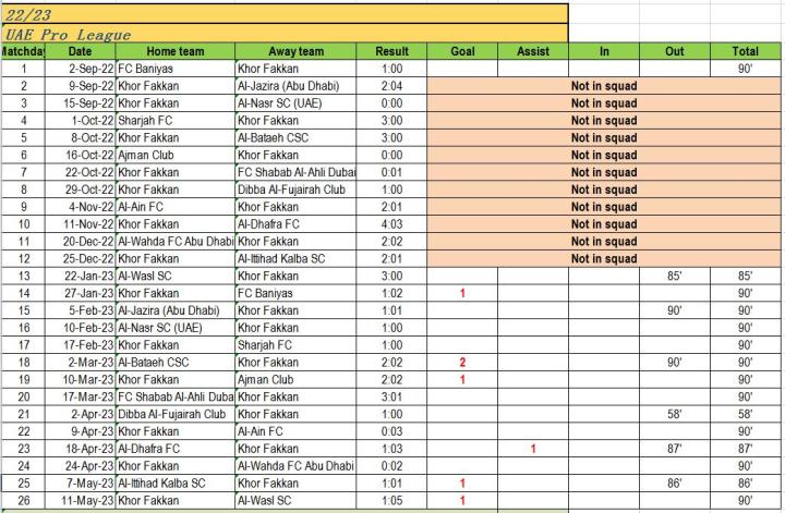 2022/2023赛季法比奥.阿布鲁阿联酋超出场情况