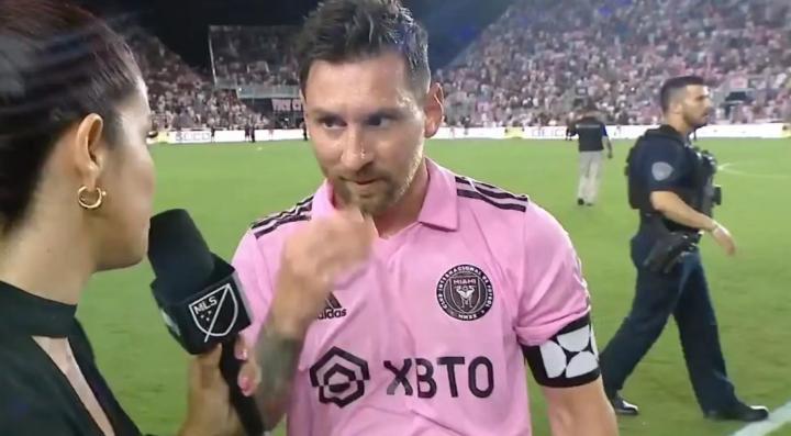 梅西绝杀后接受采访,安保人员持枪在身后经过......