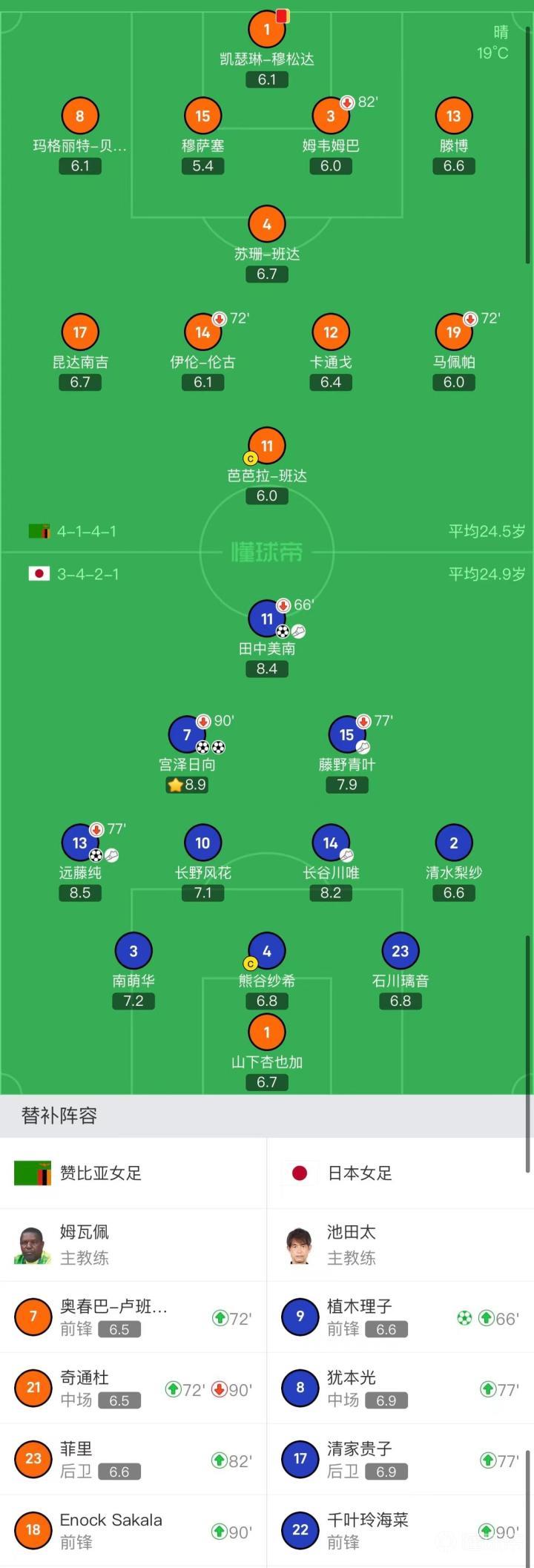 赞比亚女足首发:1-凯瑟琳-穆松达(90+9'18-萨卡拉)、3-姆韦姆巴(82'23-菲里)、8-玛格丽特-贝莱穆、13-滕博、15-穆萨塞、14-伊伦-伦古(72'21-奇通杜)、12-卡通戈、4-苏珊-班达、17-昆达南吉、19-马佩帕(72'7-奥春巴-卢班德吉)、11-芭芭拉-班达