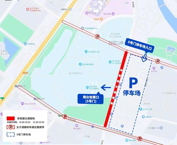 请自行导航至太子湖路武汉体育中心5号门对面停车场,停车后步行至5号门检票入场。