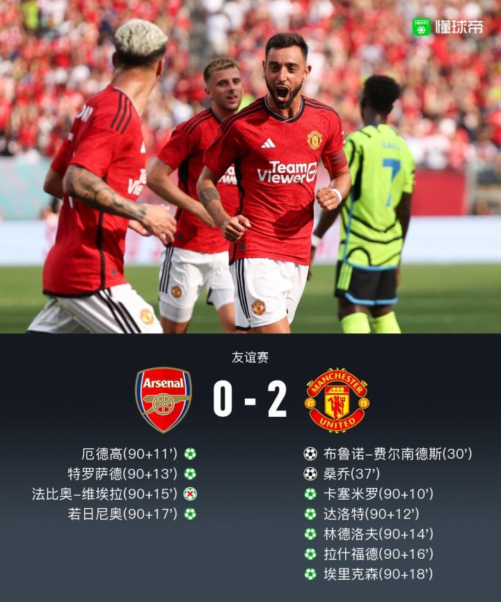 北京时间7月23日,阿森纳与曼联在美国进行了一场友谊赛的较量。布鲁诺-费尔南德斯为曼联首开记录,随后桑乔破门,曼联在常规时间以2-0获胜。接下来比赛进入点球大战,法比奥-维埃拉将点球射飞,曼联则五罚全中,最终曼联在点球大战中5-3再次获胜。