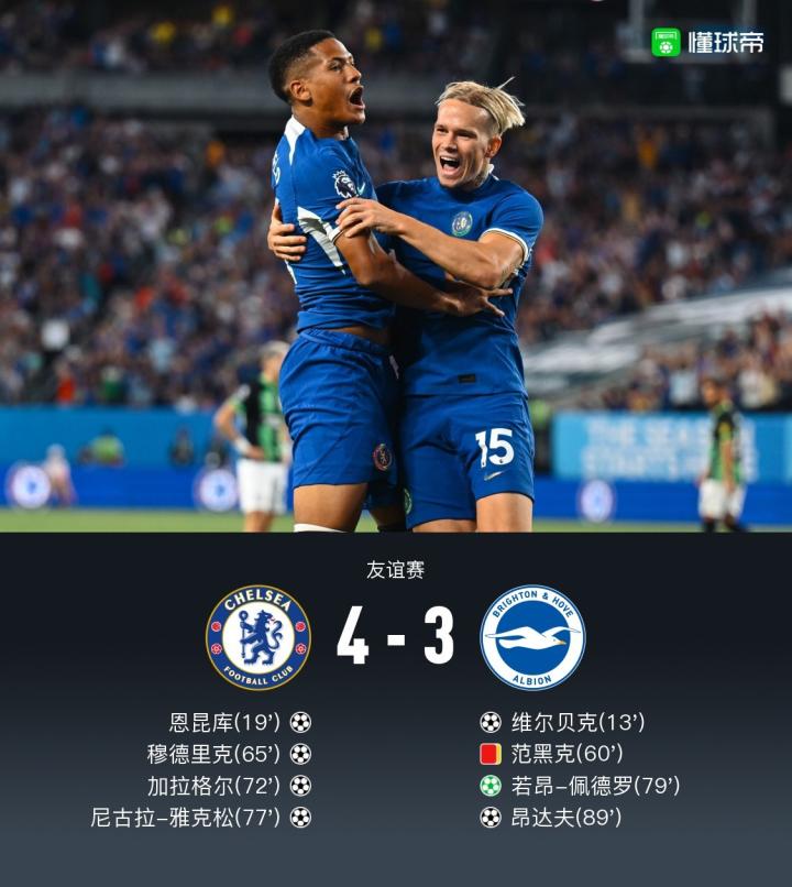 北京时间7月23日友谊赛,切尔西主场对阵布莱顿。切尔西恩昆库破门,穆德里克破门,加拉格尔破门,尼古拉-雅克松破门。布莱顿维尔贝克破门,昂达夫破门,若昂-佩德罗破门。最终比分4-3。