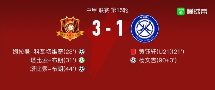 北京时间7月23日中甲 联赛 第15轮,丹东腾跃主场对阵无锡吴钩。丹东腾跃姆拉登-科瓦切维奇破门,塔比索-布朗梅开二度。无锡吴钩杨文吉破门。最终比分3-1。