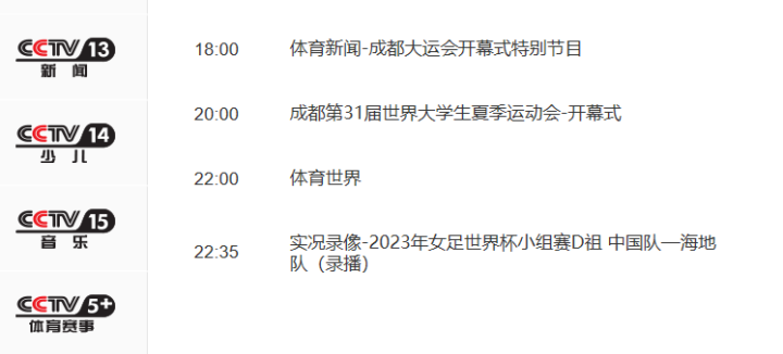 据悉,中国女足与海地女足比赛的时间段,正好赶上成都第31届大学生夏季运动会开幕式举行,所以,央视体育频道(CCTV5)、体育赛事频道(CCTV5+)、奥林匹克频道(CCTV16),将从20:00开始,并机直播成都大学生运动会开幕式。