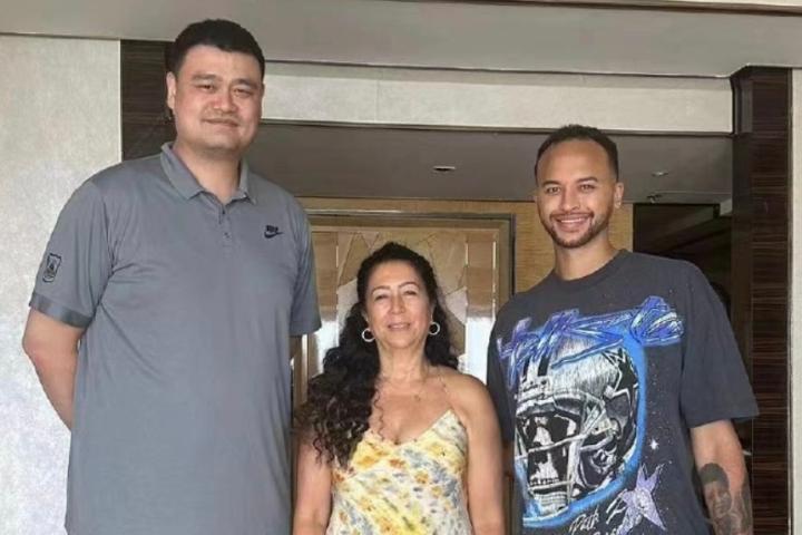 李凯尔及其母亲与中国篮协主席姚明合影