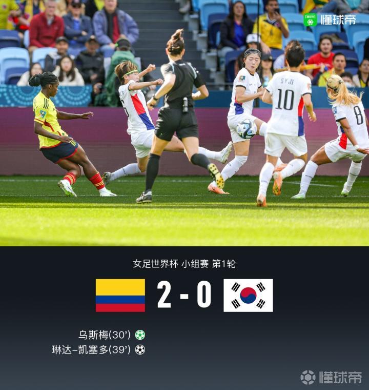 第38分钟,哥伦比亚再次破门,琳达-凯塞多一脚射门,尹英契扑救脱手,球飞入球门,哥伦比亚2-0韩国!