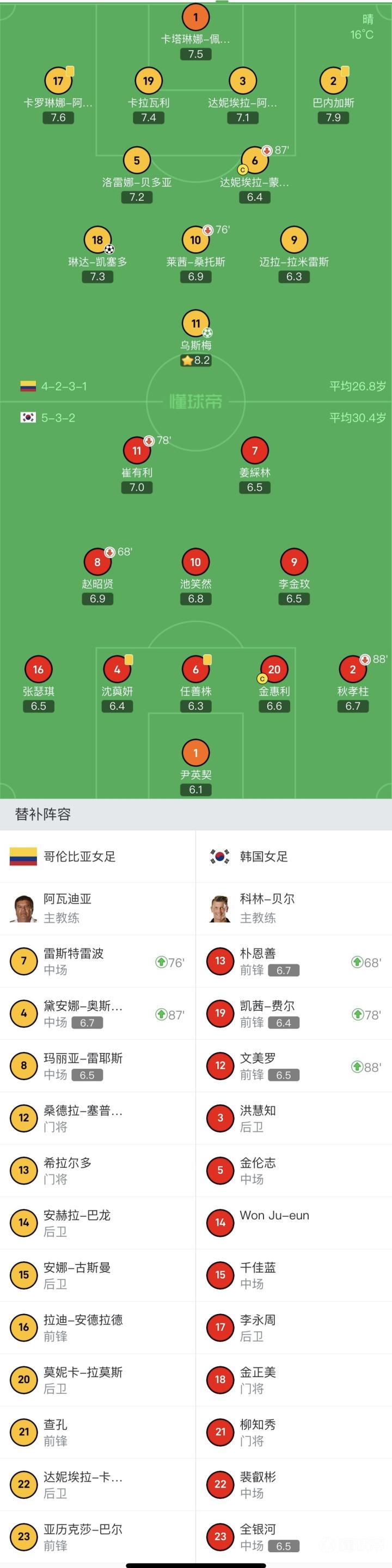 哥伦比亚女足首发:1-卡塔琳娜-佩雷斯、17-卡罗琳娜-阿里亚斯、3-达尼埃拉-阿里亚斯、19-卡拉瓦利、2-巴内加斯、5-洛雷娜-贝多亚、11-乌斯梅、6-达尼埃拉-蒙托亚、18-琳达-凯塞多、10-莱西-桑托斯、9-迈拉-拉米雷斯