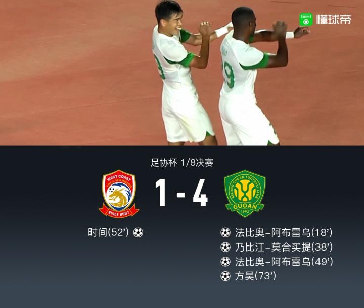 国安4-1青岛西海岸,晋级足协杯八强战山东,阿布雷乌双响
