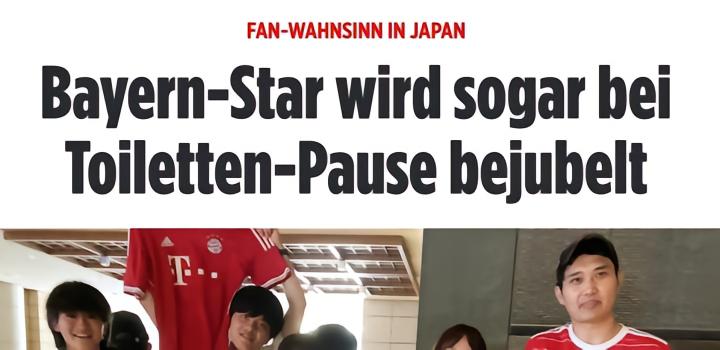 目前拜仁慕尼黑正在日本进行季前备战,德国媒体《图片报》专门撰文称赞了日本球迷的热情。《图片报》表示,日本球迷对拜仁非常欢迎,就连拜仁球员上厕所时都受到了日本球迷的欢呼。