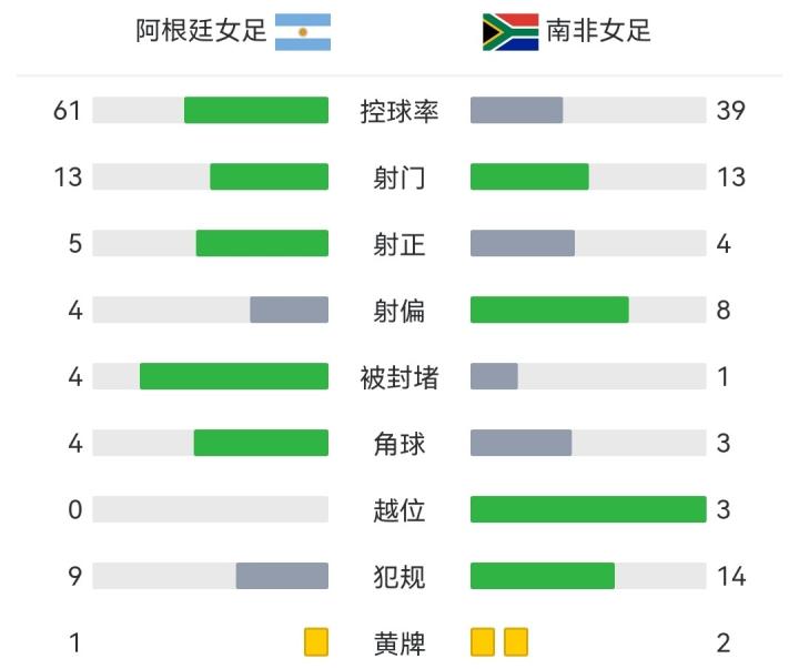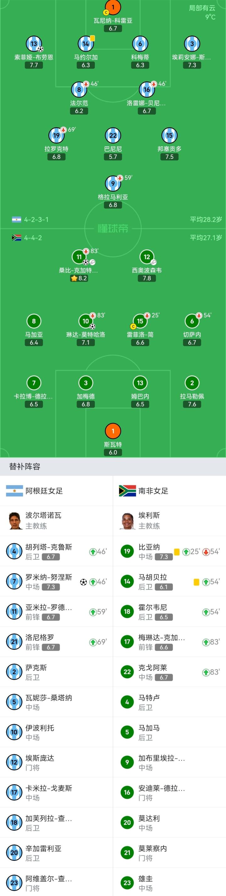 阿根廷女足首发:1-瓦尼纳-科雷亚、3-埃莉安娜-斯塔维莱、6-科梅蒂、14-马约尔加、13-索菲娅-布劳恩、16-洛雷娜-贝尼特斯(46'4-胡列塔-克鲁斯)、8-法尔范(46'7-罗米纳-努涅斯)、9-格拉马利亚(59'11-亚米拉-罗德里格斯)、15-邦塞贡多、19-拉罗克特(69'21-洛尼格罗)、22-巴尼尼