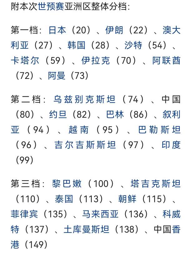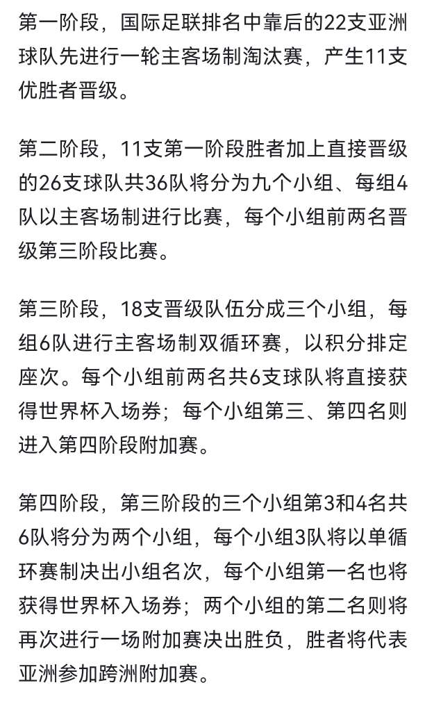 国足过三关斩六将或能打上末班车 中国男足最大的特点就是异常稳定,被牢牢的摁在了二三四流之间,这主要看分几个小组。2022世界杯预选赛勉强进入12强赛,10场比赛只赢了1场,大年初一输给越南,早早无缘晋级资格,最终排名小组第五。 眨眼间,2026世界杯亚预赛36强赛分组抽签已结束,中国男足与韩国、泰国、新加坡/关岛,分在C组。2026世界杯扩军到48队,亚洲分到8.5个名额,中国男足又重燃杀入世界杯决赛圈的希望之火! 客观上讲,2026年美加墨世界杯中国男足入围的希望不大,幸福来的太突然了,中国男足还没准备好临门一脚怎么踢。就像2002年世界杯,是1998年法国世界杯扩军到32支球队的下一届。 2026世界杯亚预赛中国队要过三关斩六将才有可能搭上进入决赛圈的末班车! 第一关,36强赛迫在眉睫。 需要击败泰国和新加坡(大概率),和韩国争小组第一就不用考虑了,反正是入围赛,小组第二效果一样。所以最稳妥的方式就是击败泰国和新加坡,但很有可能和泰国算净胜球,这一关最关键的是11月16日在泰国的主场要拿分,3分更好,1分也能接受,可以说首战即决战! 第二关,18强赛没有奇迹。 如果能够闯到这一关,想在3个小组中取得前2直接出线,我相信中国男足没有创造奇迹的能力。按照现在的排名模拟一下分组,日本、伊朗、澳大利亚,韩国、沙特、卡塔尔,这是上届世界杯的亚洲6强,中国队能挤掉谁?所以说和后面的伊拉克、乌兹别克斯坦、阿联酋、阿曼和越南、巴林争个小组第4,打附加赛更符合实际和实力,这一关需要再挤掉2个对手。 第三关,附加赛殊死一搏。 18强赛3组排名3、4名的6支球队,分成2个小组中立场地单循环决胜,每个小组第一直接出线,这是中国男足晋级决赛圈的最好机会,如果去踢洲际附加赛无论欧美非还是大洋洲,都比亚洲强,不好踢!这一关需要全力以赴,舍命一搏,再击败2个对手。