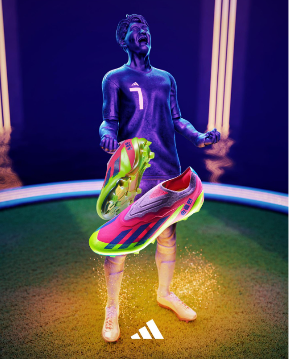小李子足球球鞋选用孙兴慜惯用的阿迪达斯X系列无鞋带战靴为基础,在升级之后就是X Crazyfast.1,再辅以荧光黄、玫红、蓝、紫色进行装饰,其灵感源自首尔夜晚街道多彩的霓虹灯光效果及繁华的夜生活,大色块组合很符合时下流行的夏日“多巴胺”风格。