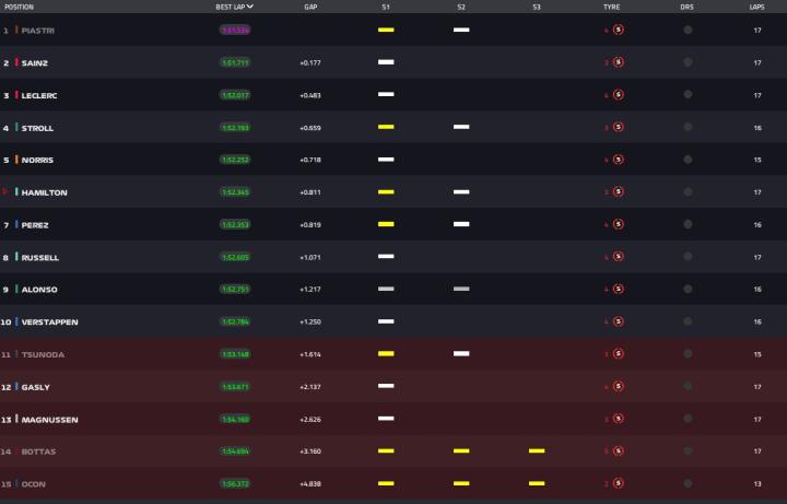 皮亚斯特里做出1分51秒534的成绩,来到第1位!塞恩斯、勒克莱尔分列2、3位。维斯塔潘仅排名第10,险些无缘Q3。