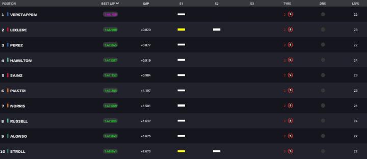勒克莱尔做出1分46秒988,来到第1位。但随后维斯塔潘做出1分46秒168的成绩,夺得杆位。佩雷兹来到第3位。