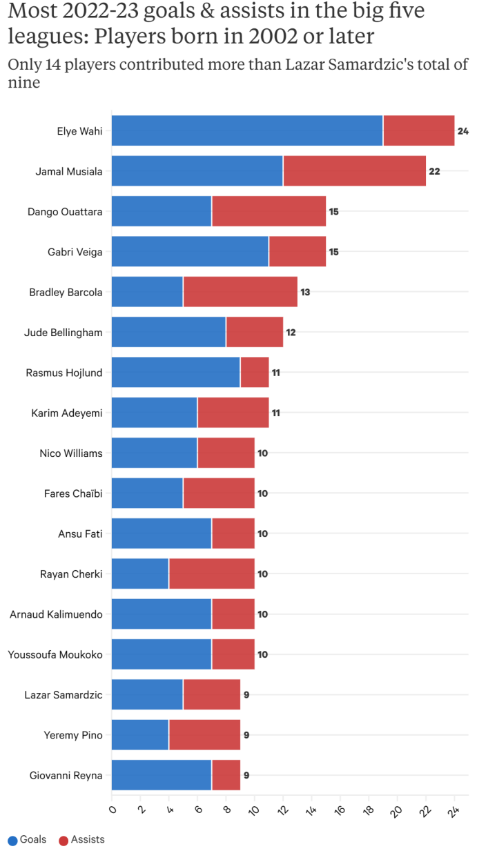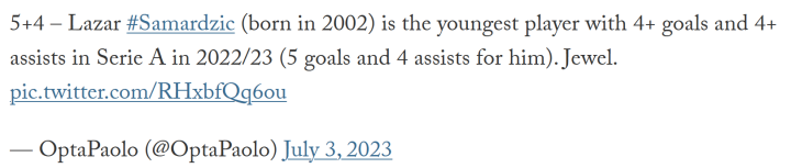 上赛季,出生于2002年的萨马尔季奇,是意甲赛场上取得4球4助(及以上数据)的最年轻球员。在上赛季五大联赛2002年及以后出生球员中,萨马尔季奇制造了9粒进球,只有14名球员比他还多。