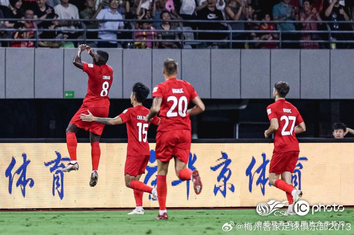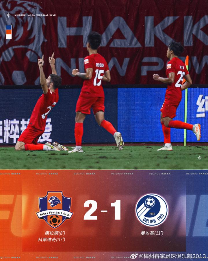 【战报·第19轮】梅州客家2-1大连人 北京时间7月29日19:35,2023中国平安中国足球协会超级联赛第十九轮比赛,梅州客家坐镇五华奥体惠堂体育场对阵大连人。 比赛开始,梅州客家展开攻势,康拉德小角度抽射率先破门,梅州先下一城,随后,曼佐基世界波扳平比分,最后茹子楠劲射被扑出后科索维奇跟进补射破门,锁定胜局!90分钟战罢,梅州客家2-1战胜大连人,拿下三分。