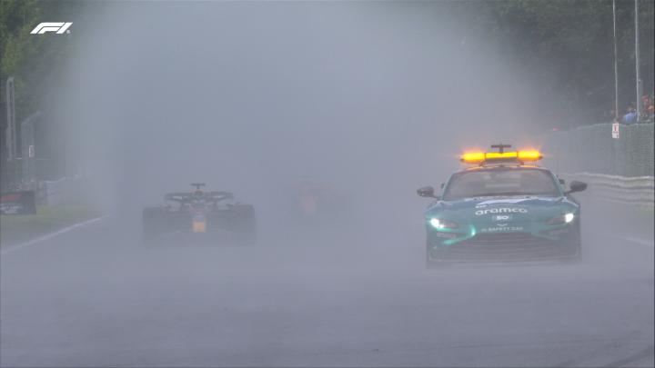 尽管赛道条件逐渐变好,但赛车扬起的水雾依然很大,能见度情况并不好。在安全车带领下完成4圈之后,20位车手进行了动态发车。
