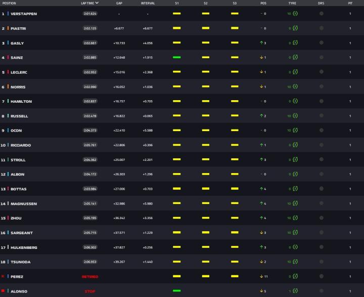 第2圈,维斯塔潘出站后落在了皮亚斯特里身后,皮亚斯特里暂时排名第1。