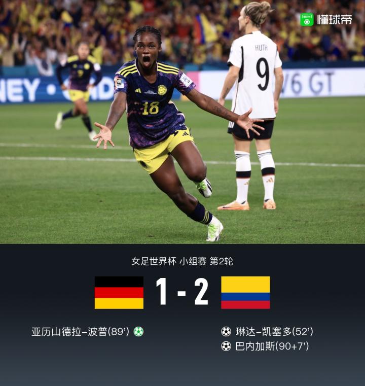 比赛读秒阶段,哥伦比亚女足角球机会,后点位置巴内加斯完成绝杀,德国1-2哥伦比亚!