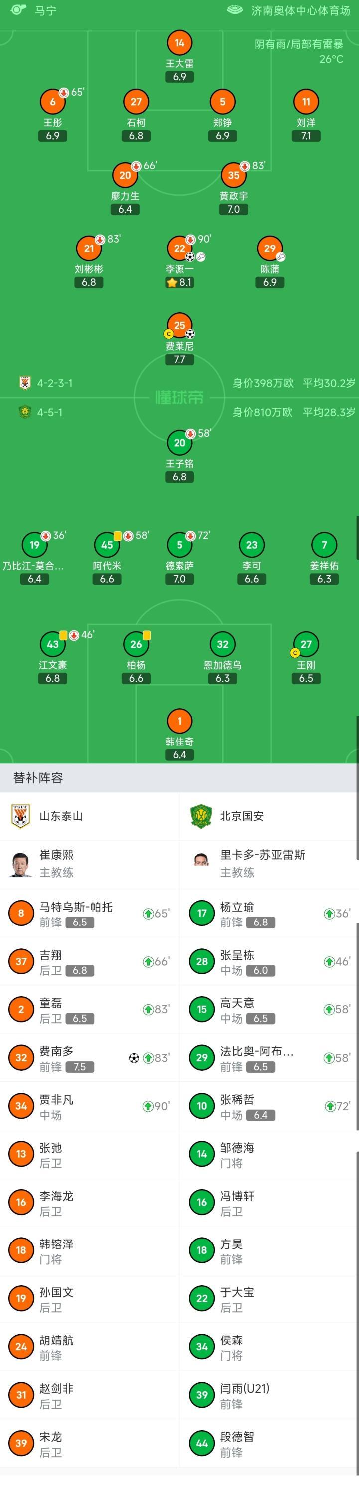 山东首发:14-王大雷、11-刘洋、27-石柯、5-郑铮、6-王彤(65′8-帕托)、35-黄政宇(83′2-童磊)、22-李源一(90+2′34-贾非凡)、29-陈蒲、20-廖力生(73′37-吉翔)、21-刘彬彬(83′32-费南多)、25-费莱尼