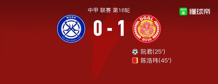北京时间7月30日中甲 联赛 第16轮,无锡吴钩主场对阵东莞莞联。东莞莞联阮君破门。最终比分0-1。