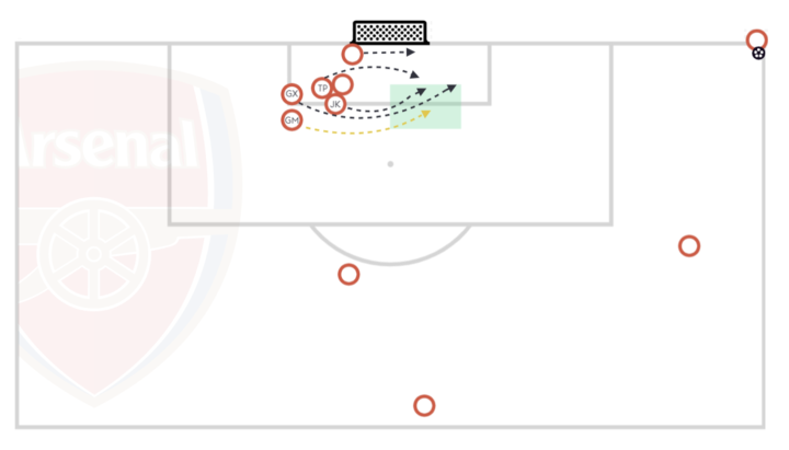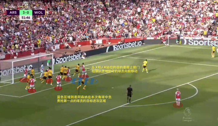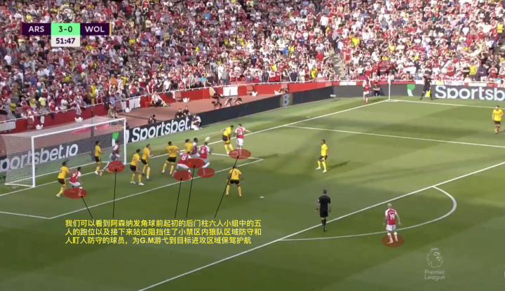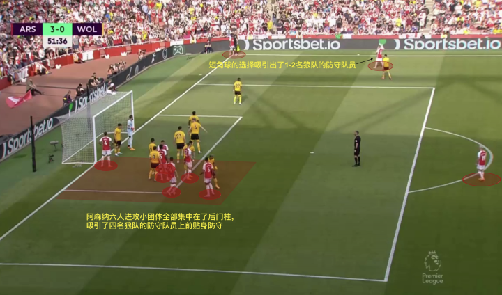 同样,阿森纳也成功应用了类似的战术,通过引诱对手形成一定的防守结构,再利用"Audibles"在最后一刻调整球员位置,让进攻队员得以从后门柱突袭,成功争抢第一点。